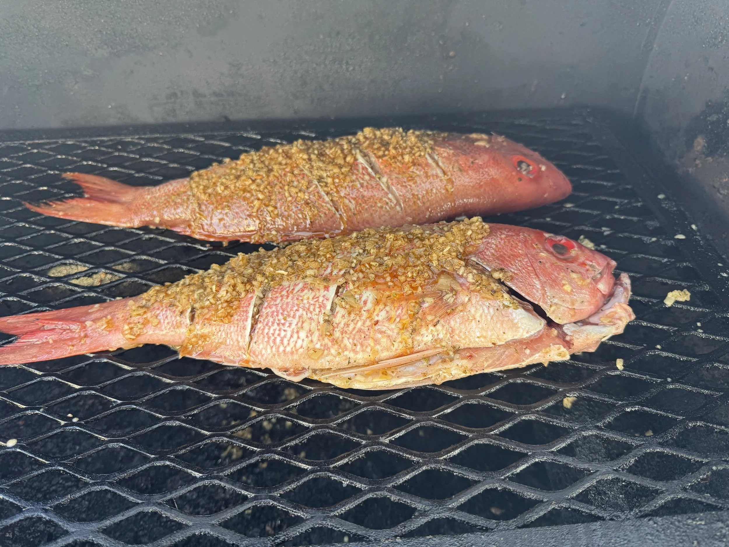 We laid the fish out, put ½ the remaining marinade on it, cooked it for ~ 15 minutes, turned it, poured on the remaining marinade finished the cook. Pull the fish when your desired temperature is reached